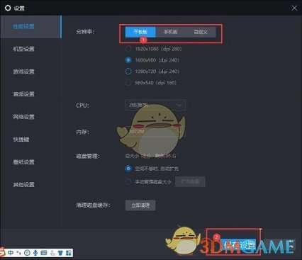 2点击性能、设置中的“平板版”,在点击“保存设置按钮”,如果图中标注所示
