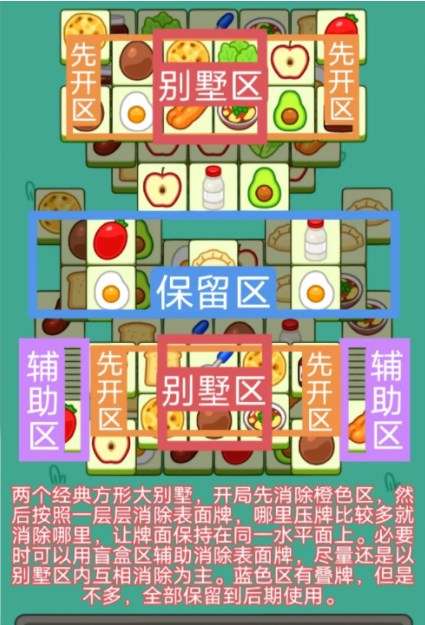 2.开局先消除橙色区的牌,这里压牌。尽量要让牌面保持在同一水平面,然后一层一层消除表面牌,不要跨层太多拿牌,等表面牌消除完后,以大别墅内互相消除为主。