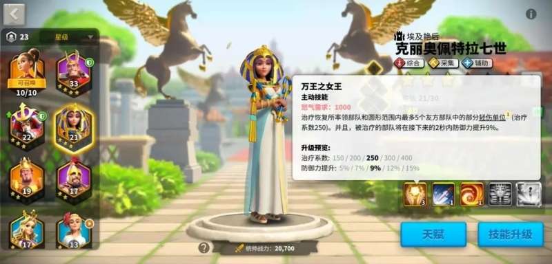 由于克丽奥佩特拉七世的定位和技能效果,所以她的发展方向只能是辅助类或者采集类的辅助型将领,技能优先升级一技能和二技能,如果只是作为采集主将的话就只拉二技能就可以了。天赋上只增加采集天赋就可以了,前期稍加培养用来采集还是挺爽歪歪的。觉醒技能虽然还不错,但是觉醒的成本还是挺高的,战略储备活动会赠送克丽奥佩特拉七世不少金头,所以不用使用通用金头来觉醒克丽奥佩特拉七世。