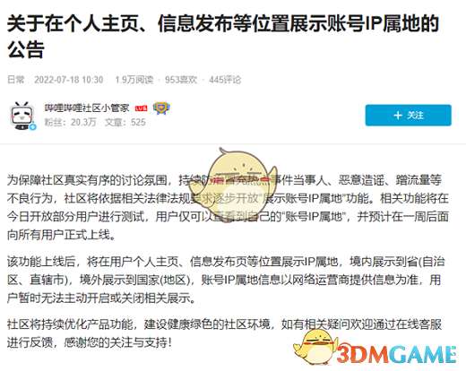 1、据B站官方宣布,从今日起将开启测试,功能预计会在一周后正式上线。有测试资格的小伙伴现在就可以在主页、信息发布页、评论区等位置可以看见属地。