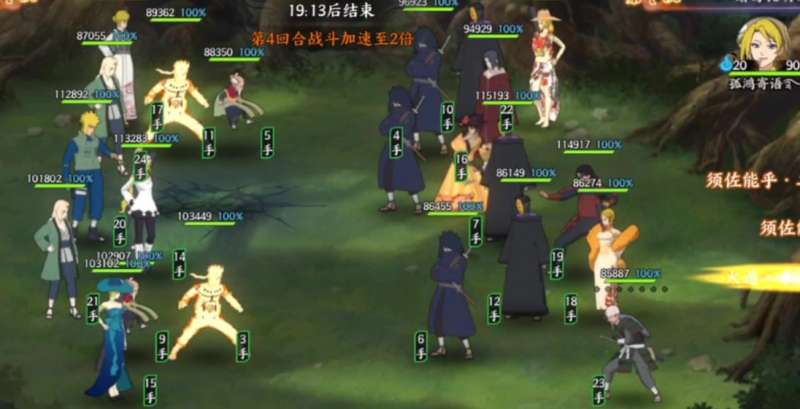在这一关里我们要面对的敌人有三位,包括鸣人。而我们能够使用的角色也有三位,站在最前面的是雏田,第二排的是志乃,最后一排则是井野。在对战开始以后,玩家需要在第一回合就立即使用雏田的奥义技能,让其降低敌方的防御与攻击属性。在第二回合开始的时候,我们就要释放井野的奥义技能,将鸣人准备释放的忍术打断,避免其对我们的忍者造成伤害。