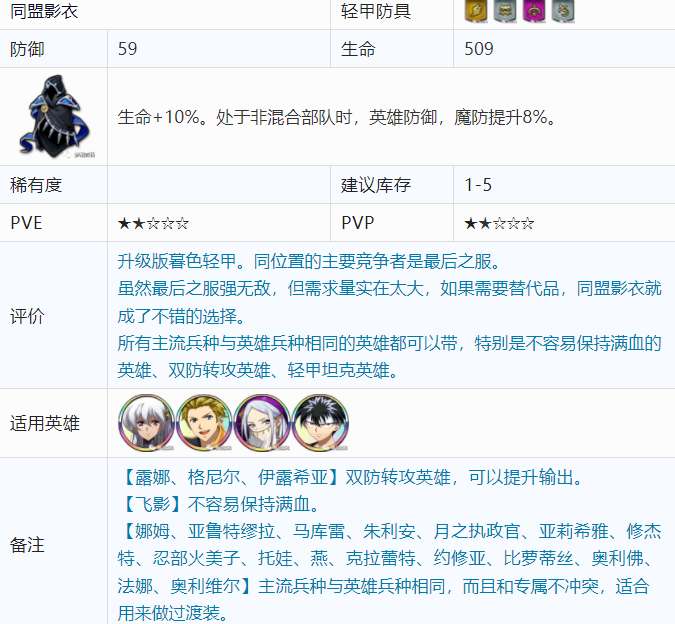 虽然最后之服强无敌,但需求量实在太大,如果需要替代品,同盟影衣就成了不错的选择。