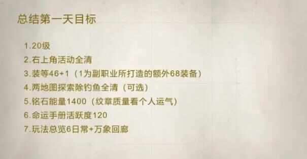 本攻略旨在为玩家提供前3天每日达成目标的指引,给玩家展示大致需要做什么,以及每日能达到的平均装等,铭石能量,地图探索,副职业等级等。