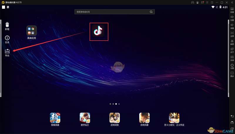 2、回到模拟器窗口主界面,首先长按模拟器窗口的“抖音”拖动到左侧出现的“导出”按钮,接着松开,然后apk所导出的文件夹会自动弹出,你要的apk文件就到手了。