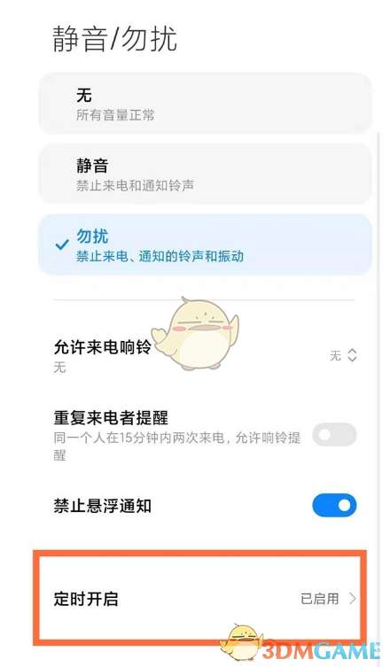 3、点击上方的【勿扰】后再点击【定时开启】,这样就设置好定时勿扰模式了。