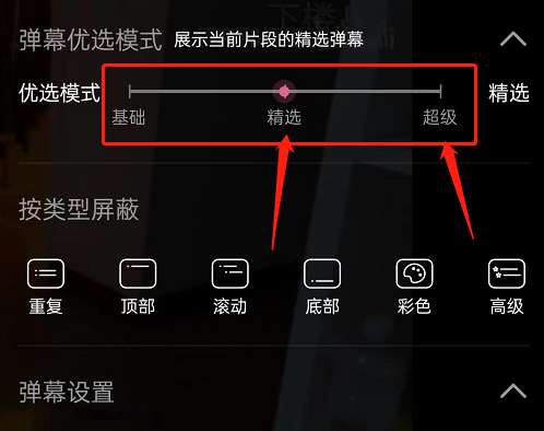 3、接着,找到弹幕优选模式,点击向下箭头。