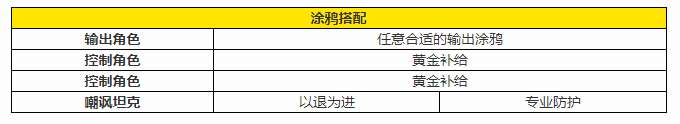 输出角色使用任意符合自身机制的输出涂装即可,而控制角色为了能在输出主C高强度抢出牌位,或是另一位控制角色抢出牌位时也有机会打得出战略价值极高的SP技能,涂鸦一律使用「黄金补给」互相喂饭。为了保证每回合都能找到带有控制效果的卡片,队伍中至少需要配备两名带有控制技能的角色以能实现稳定控制,人选可以参照下文,各种控制都会积攒BOSS的控制抵抗,因此即使错开效果也不能实现永久控制,实在控不住的时候这把就寄。