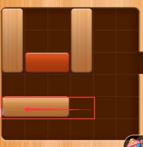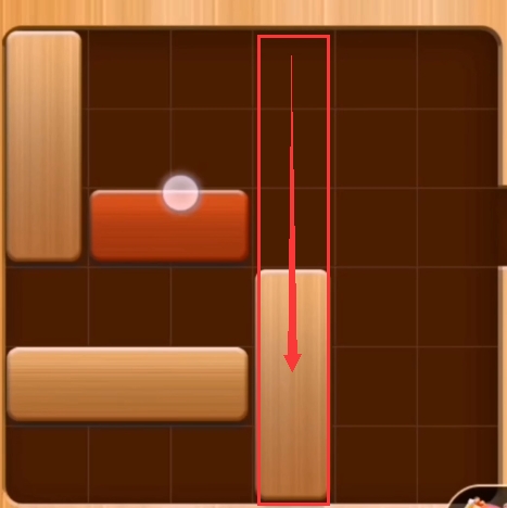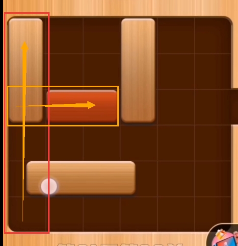 第一步:将红木往右边推,并将第一列的竖立的积木往上推(如图:)