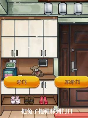 3、来到门口点击柜子上的规则,通过猫眼查看外面,然后把兔子拖鞋拖动到地毯,再选择开门。