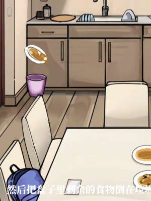 2、然后将盘子里的剩菜倒进垃圾桶,碗筷放进洗碗池;接着来到浴室,点击将妻子的发卡摘下,再将洗发水给妻子。
