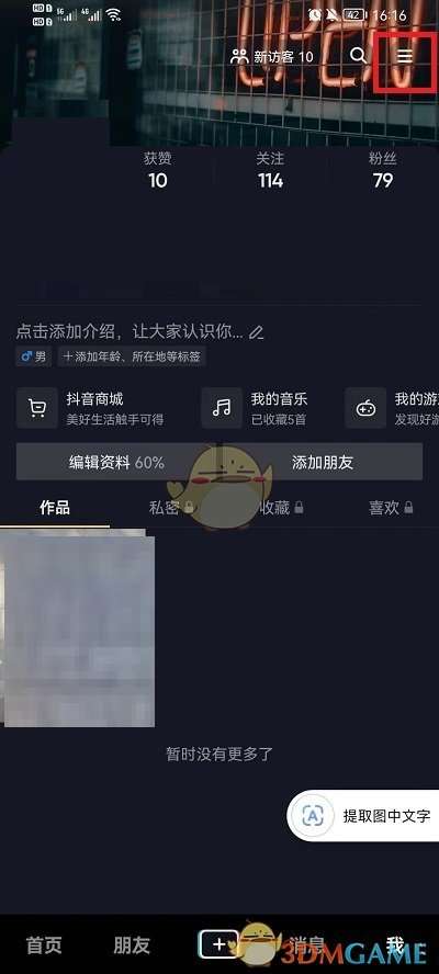 1、首先在抖音个人界面,点击右上角的【三】就会弹出界面;