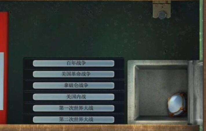 4、如图所示战争顺序是:【百年战争】-【美国革命战争】-【拿破仑战争】-【美国内战】-【第一次世界大战】-【第二次世界大战】,这样就成功打开右边的铁盒子了