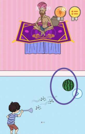 男主角吹响笛子,老头就会和飞毯一起升天,点击得到【西瓜】。
