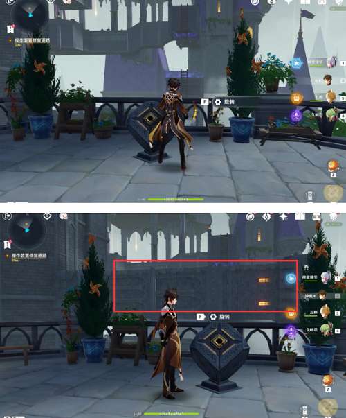 接着我们原路返回,爬上梯子,一路往前走走上大平台,在平台上我们看到了这个方块机关,操作方块机关,将中间的高塔最长的那个手臂转动过来
