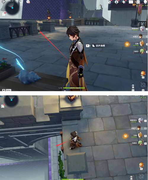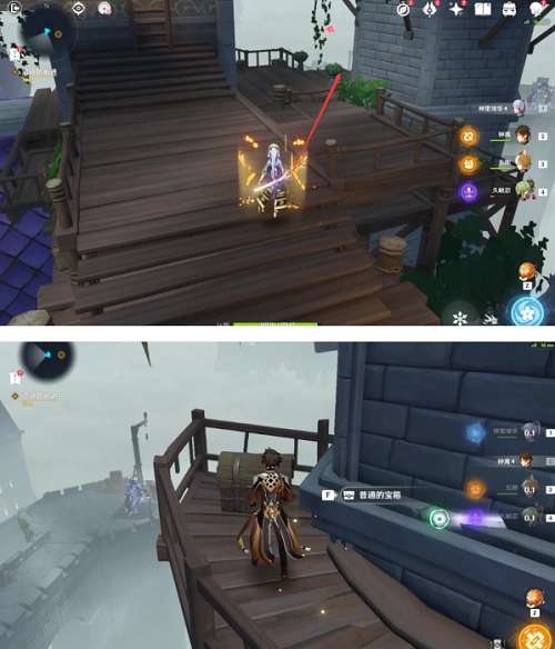 在捡完海螺之后大家先别急着走,先往如图所示的地方看,在这里有一个楼梯和一个平台,往下跳之后我们就能看到本秘境的第一个宝箱啦
