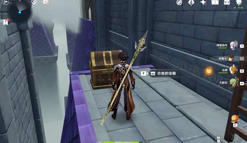 在走到这个爬梯处的时候先往咱的右手边方向走,顺着栈道一路上旋,在道路尽头发现我们的第二个宝箱。
