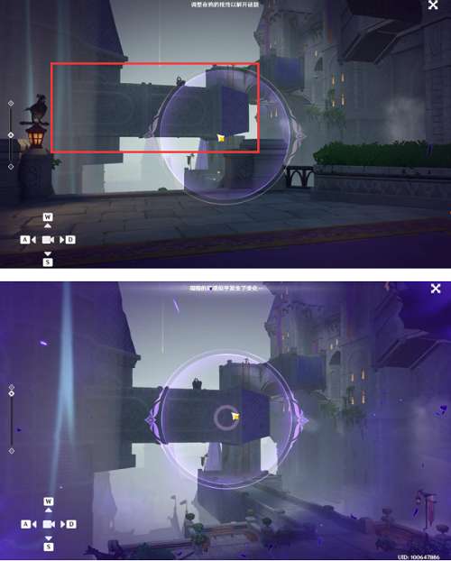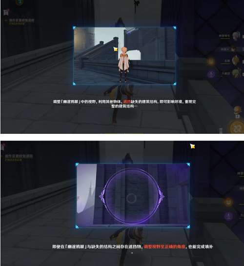 操作方形装置将塔的短臂移动过来,然后走上平台使用幽夜装置完成填补(装置调整到最左边,视角放到最大)