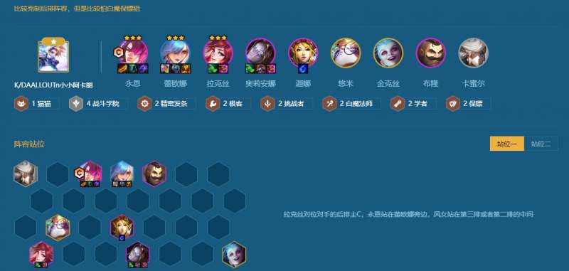 战斗学院永恩目前在版本来说,可以排到t1位置,并且在大师局的吃分吃鸡效果都不错,有很多人已经卷起来了。这个阵容主要是靠着永恩的高伤害以及技能机制能够轻松切掉后排而存活的。可以说除了保镖狙也就大成九五可以和这个阵容一战了。