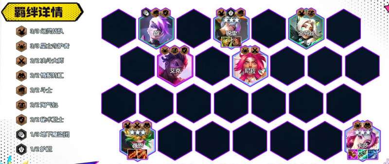 2、羁绊效果:3幻灵战队3星守2决斗2特工2斗士2淘气包2秘卫,站位与装备羁绊选择如下图所示: