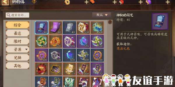 2、可以在「纳物库」中根据「最近」「限时」「资源」「兑换」和「其他」分类进行物品的筛选与查找。