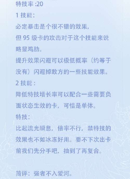 这张卡怎么说呢,本质上就是花瓶,具体的技能特技如图所示,如果非要在它跟白城还有旅途之间选一个养的话那还是建议养它。