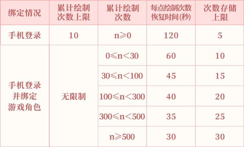 手机登录并绑定游戏角色后,初始拥有10点的绘画次数存储上限,每点恢复时间为60秒,将随大人们逐步累计的绘制次数而缩短恢复时间与提高次数存储上限。