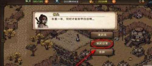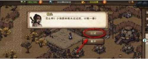 2、此时教头会提出比武的请求,接着选择【比武】选项,这样就会跟教头进行比武了。只能主角一人上场,所以比武之前记得吃药,喝酒和烧香增加buff,就可以成功战胜教头了,战胜教头后再答应教头指点士卒。