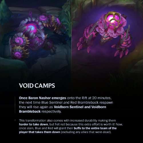 当纳什男爵刷新时,红/蓝buff 下一次刷新时将化为虚空生物。变身后的它们更加强壮,击杀难度更高,在被击杀后会为击杀者的全队提供加成(击杀时处于阵亡状态的队友除外)。