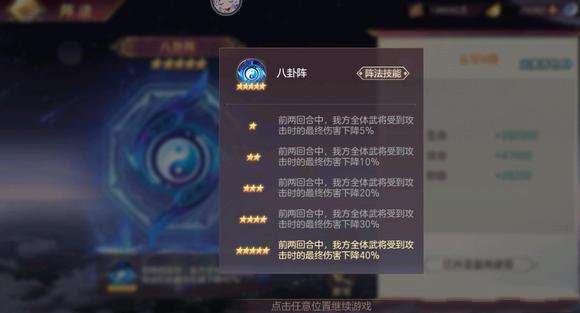 阵法:八卦阵是性价比最高的阵容,锋矢与鹤翼优先级较低。八卦能减少伤害甚至真伤以及百分比伤害,而锋矢无法第一回合触发并不契合灭队,因此无论抗队灭队都先拉满八卦阵(八卦可以被清阵,可以点个一星锋矢减少八卦被清除的概率)