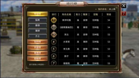 排行榜分为等级榜、加持榜、士兵榜、军团榜、国战榜,每小时进行更新排行。