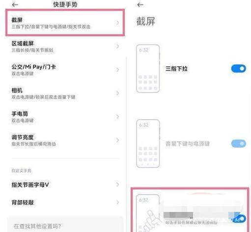 点击手机设置-更多设置-快捷手势-截屏,启用指关节双击功能。