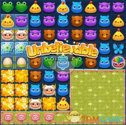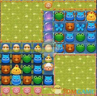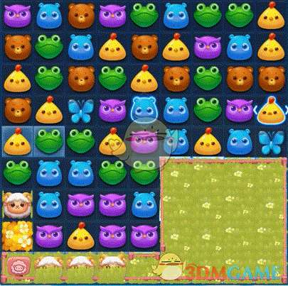 3、第三步:贴边击打咩咩羊或组合直线特效打鸡窝,散落小黄鸡形成三消机会,送咩咩羊进羊圈。