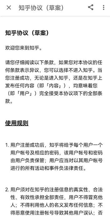 第三步:进入知乎协议后即可看到协议内容,如下图所示。