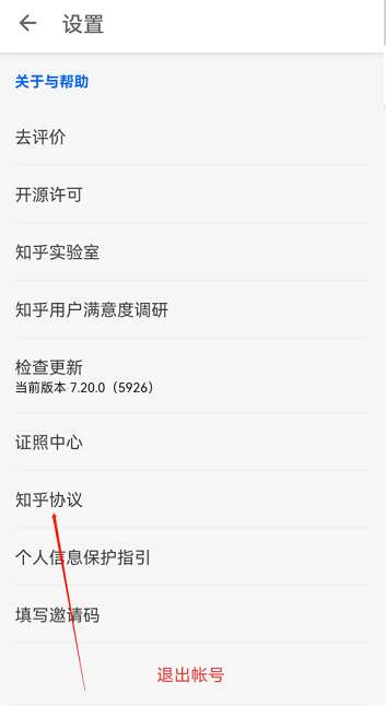 第二步:进入设置页面后,往下拉到底,点击知乎协议。