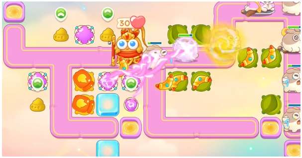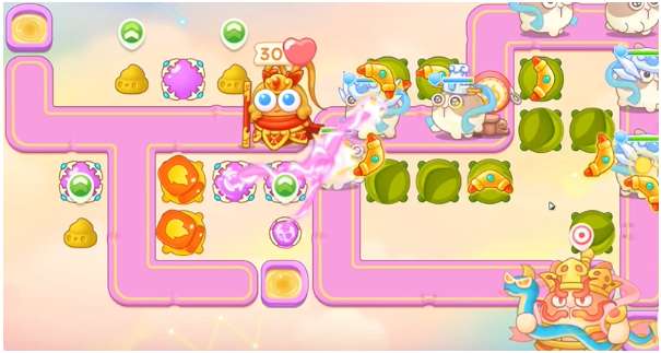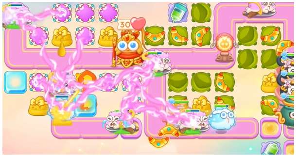 4、左边魔法球把桃子打掉,桃子空出位置,建立火炮,继续清理周围障碍物。