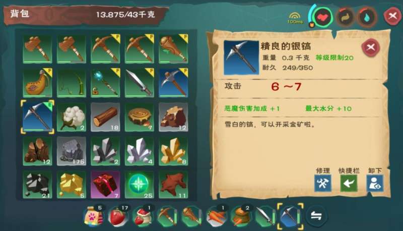 虽然游戏当中的装备种类很多,效果也不相同,但是要说组简单实用的,还得是木斧。作为新手前期最简单的装备,木斧不仅可以帮助玩家进行砍树的工作,连一些矿石也同样能用木斧获取。在面对棘手的敌人时,木斧也能充当武器使用,比直接攻击的效果会强力不少。当然,这仅限于前期,什么等级就要用什么级别的武器,30级以上可以用黄金制作武器,40级以上用水晶做武器,这样在面对高等级怪物的时候,才能有效的输出。