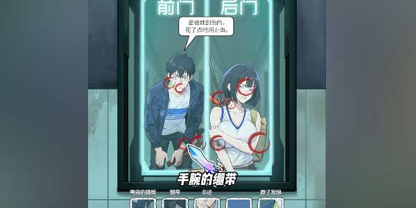 2、接着来到走后门回来的闺蜜吗,找出她身上可疑的地方,分别是:女朋友红红的眼睛,脖子上不知名的抓痕,受伤的手臂,身后的背包和肩膀上的子弹。