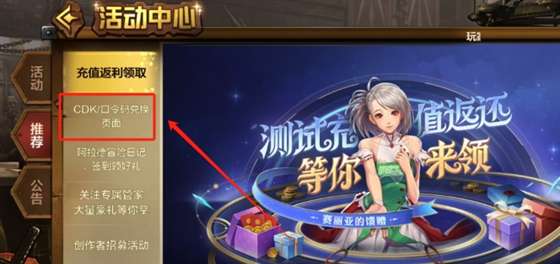 3、然后点击推荐活动下的“CDK/口令码兑换”活动;