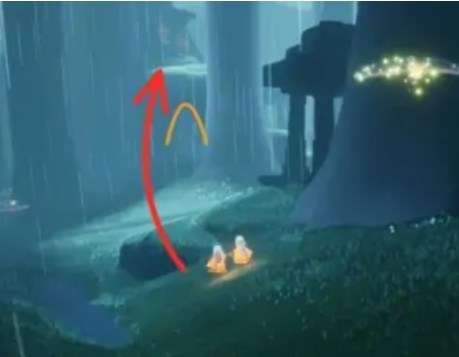3、在树屋对面即可看到胆小先祖,就在雨伞先祖右边的树桩下。