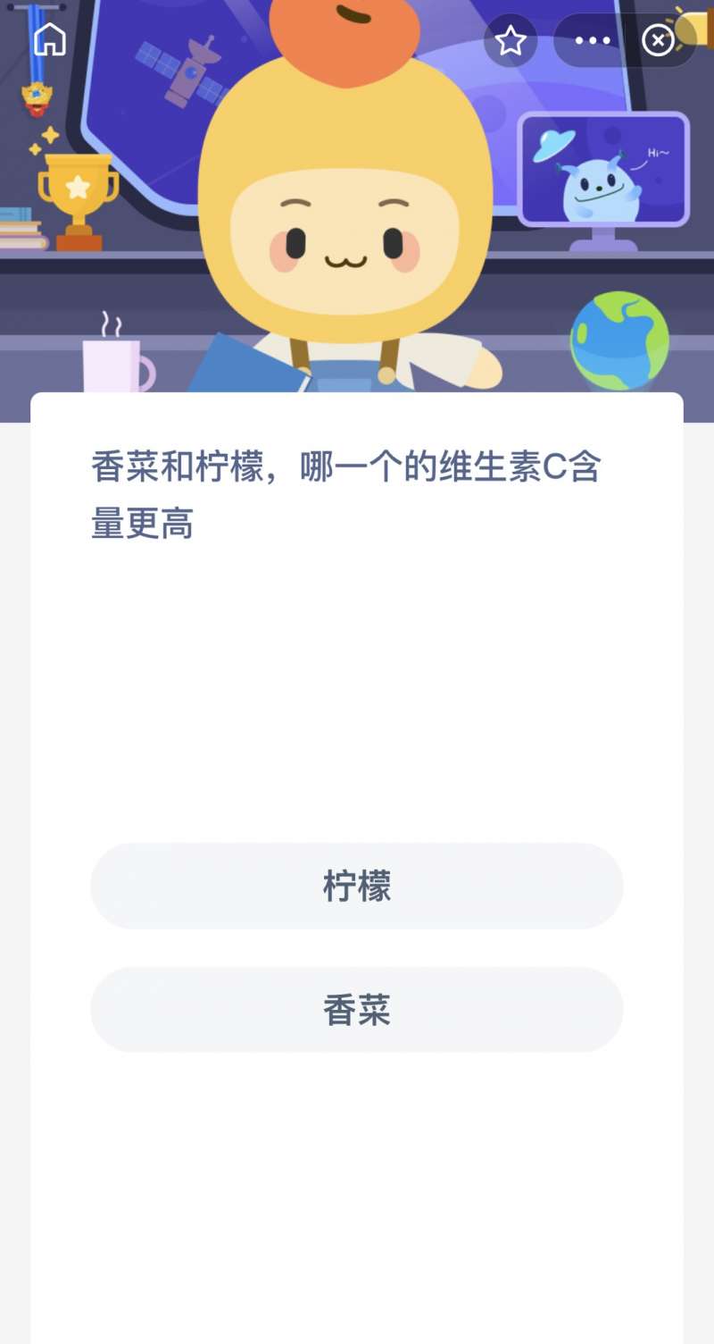 2022支付宝蚂蚁新村7月10日的题目为:香菜和柠檬,哪一个的维生素C含量更高?柠檬还是香菜呢?可能还有很多小伙伴都不太清楚。下面小编就为大家带来了正确答案分享,希望能帮助到你。