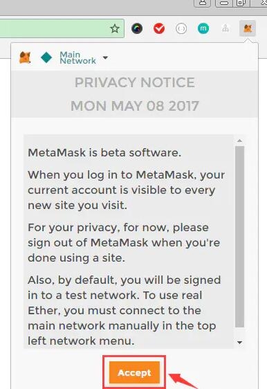 这里提示用户,当登录到MetaMask之后,你的账户对你访问的所有网站都是可见的,为了你的隐私,在使用完MetaMask之后最好退出登录。