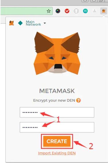 3、接下来有两个选择:可以导入以前的账号,也可以创建新账号。DEN的意思是在MetaMask用密码加密存储的钱包