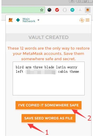 在点击CREATE按钮后,MetaMask会为用户创建12个英文助记词,一定要保存好这些助记词,点击SAVE SEED WORDS AS FILE可以将助词词以文件的形式保存到本地,建议使用纸笔手工记录并收藏于安全的地方。