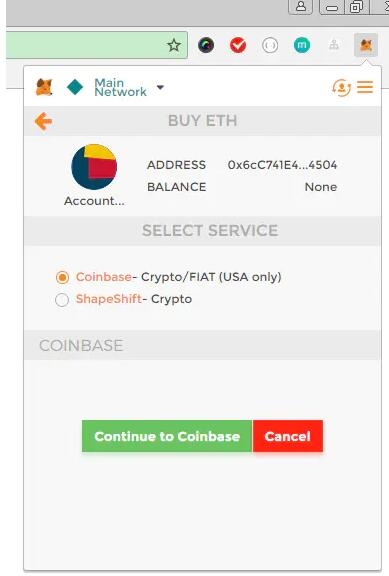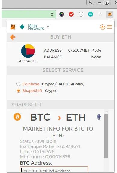 从这个页面可以看到,MetaMask支持两种购买Eth的方式,一种是从Coinbase购买,一种是通过ShapeShift。