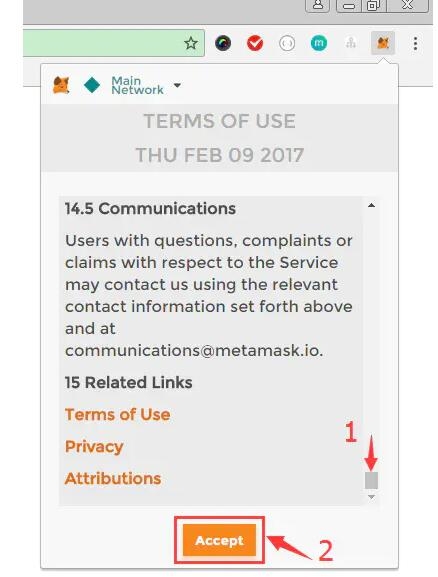 2、点击Accept按钮,显示的是MetaMask的服务条款,如下图2-2: