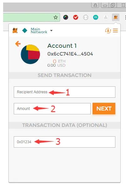 如图3-3,分别填写“要发送到的ETH地址”、“要发送的ETH数量”、“发送信息数据(可选)”,点击NEXT即可