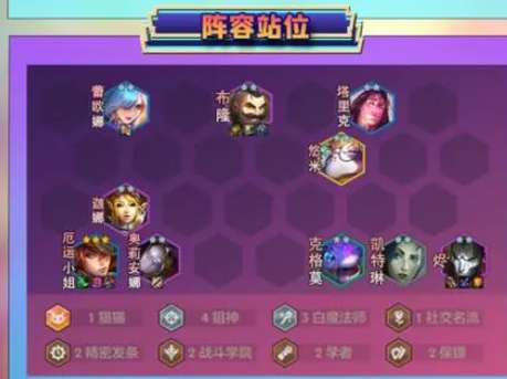 11、八人口后提升一下阵容整体质量,将全员二星后就可以继续卡利息升九人口。如果社交名流的格子不在最后一排的话,可以下塔里克,替换成悠米可以开出2战斗学院2学者羁绊,并且还会提供稳定的群体控制效果。