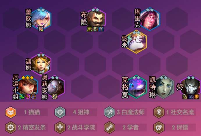 1、该阵容由厄运小姐、凯特琳、克格莫、蕾欧娜、布隆、迦娜、烬、奥利安娜、悠米/塔里克组成;羁绊由4狙神、3白魔法师、1社交名流、2精密发条、2战斗学院、2学者、2保镖构成。