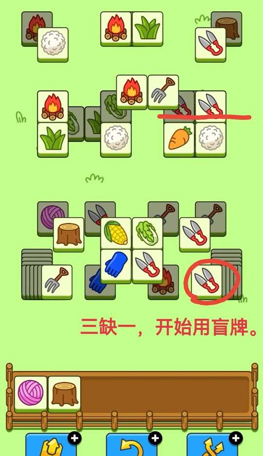 使用盲盒节点:自消到消不动时,一般在快进入小主攻区时,如下图,三缺一的“一”,会恰好是盲牌!