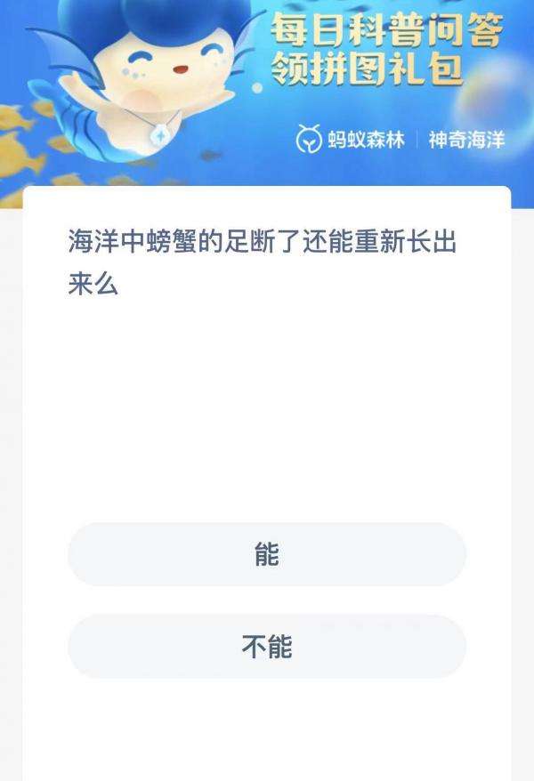 2022支付宝蚂蚁海洋7月28日的题目已经更新了,今天的题目为:海洋中螃蟹的足断了还能重新长出来么?正确答案是什么?能还是不能呢?很多小伙伴可能还不太清楚。下面小编就为大家带来了正确答案分享,希望能帮助到你。